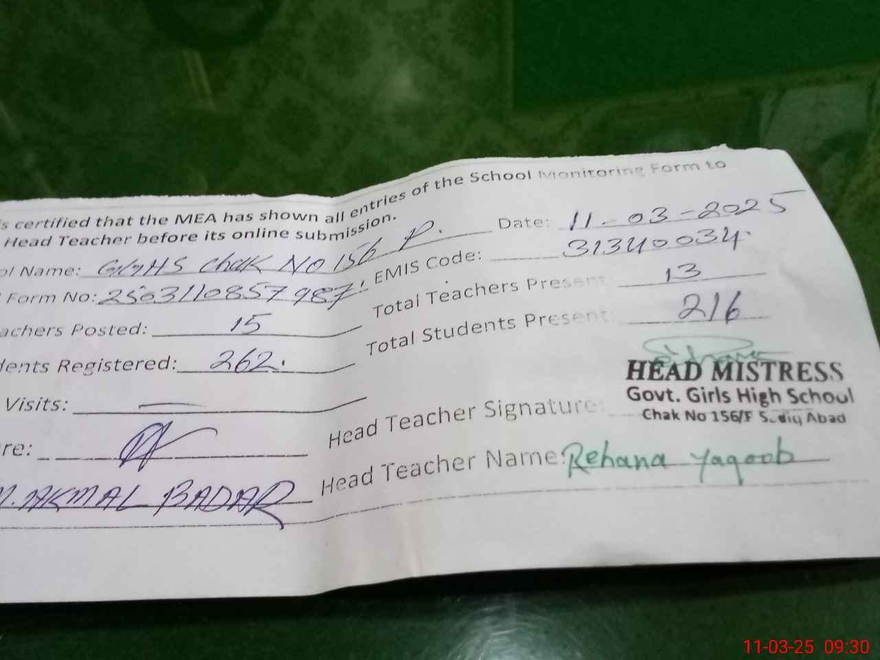 | Name: Re**** Ya**** Designation: (School Headmaster's/Headmistress's) H M Phone/Cell Number: 03**** |