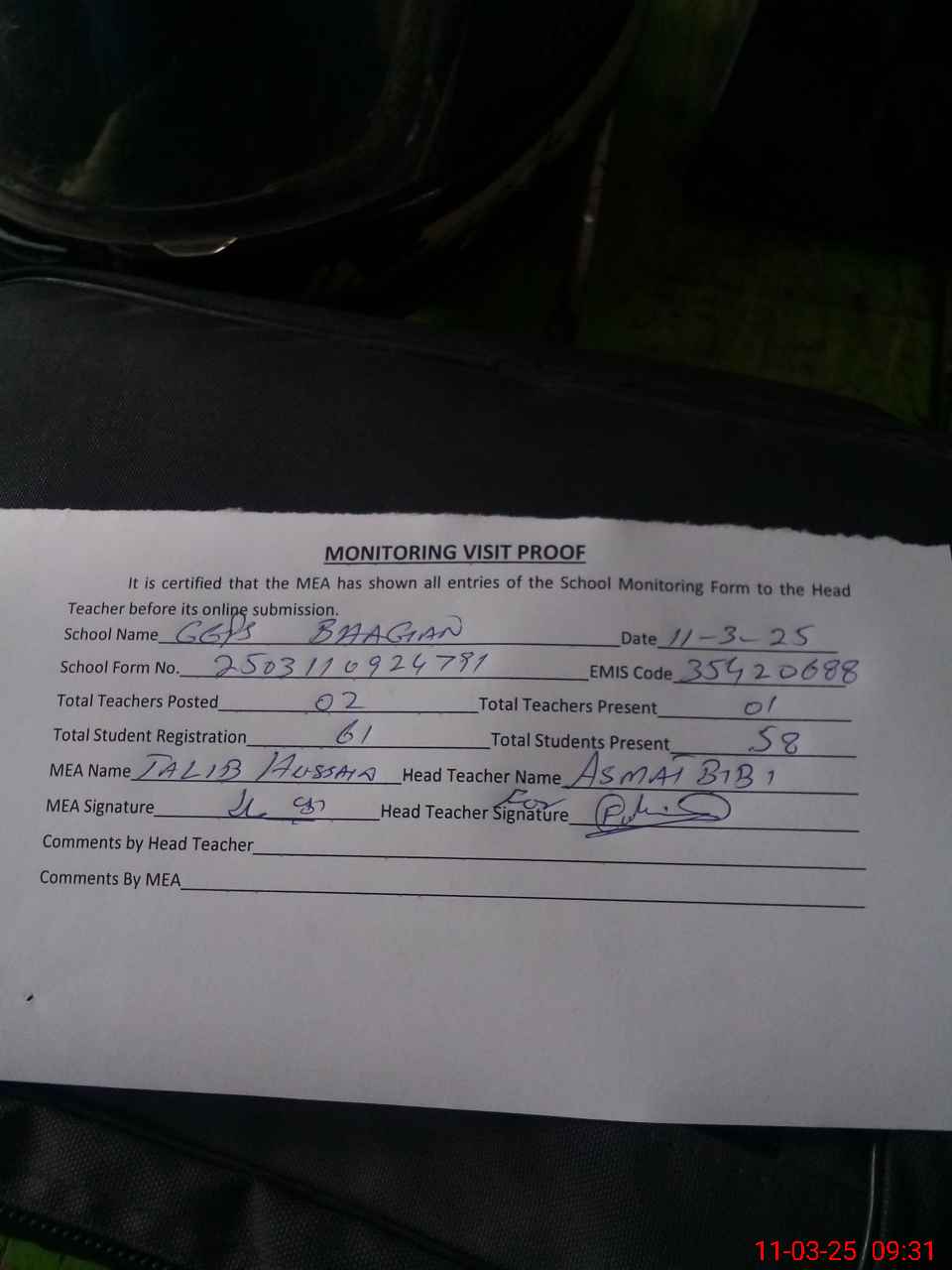 | Attendance Register | Head Teacher | MEA with School | Visit Proof |