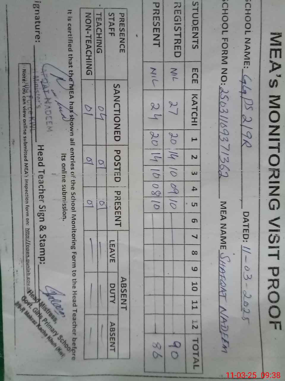 | Attendance Register | Head Teacher | MEA with School | Visit Proof |