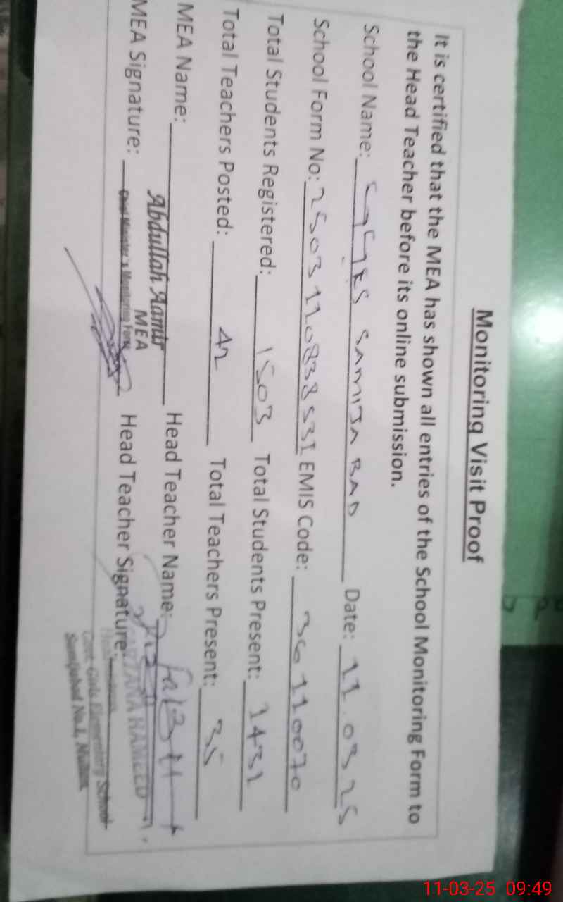 | EMIS Code: 36110070 | Name of School: GGES SAMIJABAD NO.1 MULTAN | |||