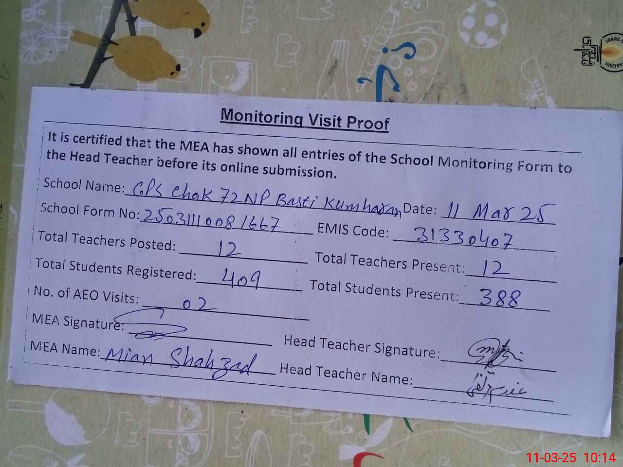 | Attendance Register | Head Teacher | MEA with School | Visit Proof |