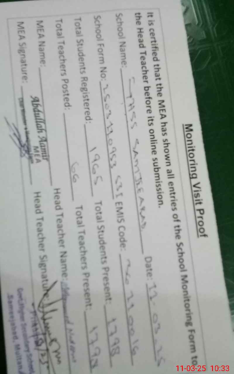 | EMIS Code: 36110016 | Name of School: GHSS SAMEEJABAD MULTAN | |||