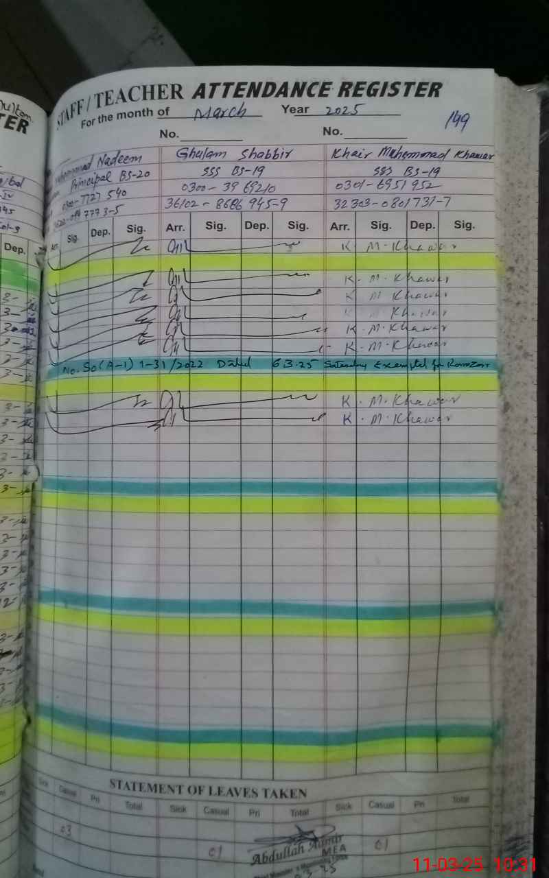 | Name: kh**** Me**** Ch**** Designation: (School Headmaster's/Headmistress's) In Charge PRINCIPAL Phone/Cell Number: 03**** |