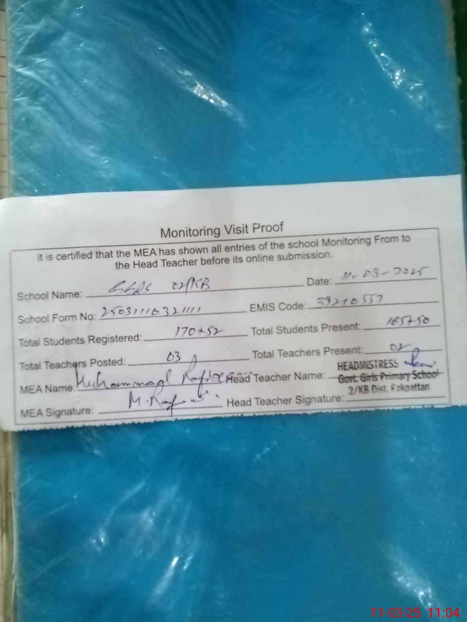 | Attendance Register | Head Teacher | MEA with School | Visit Proof |