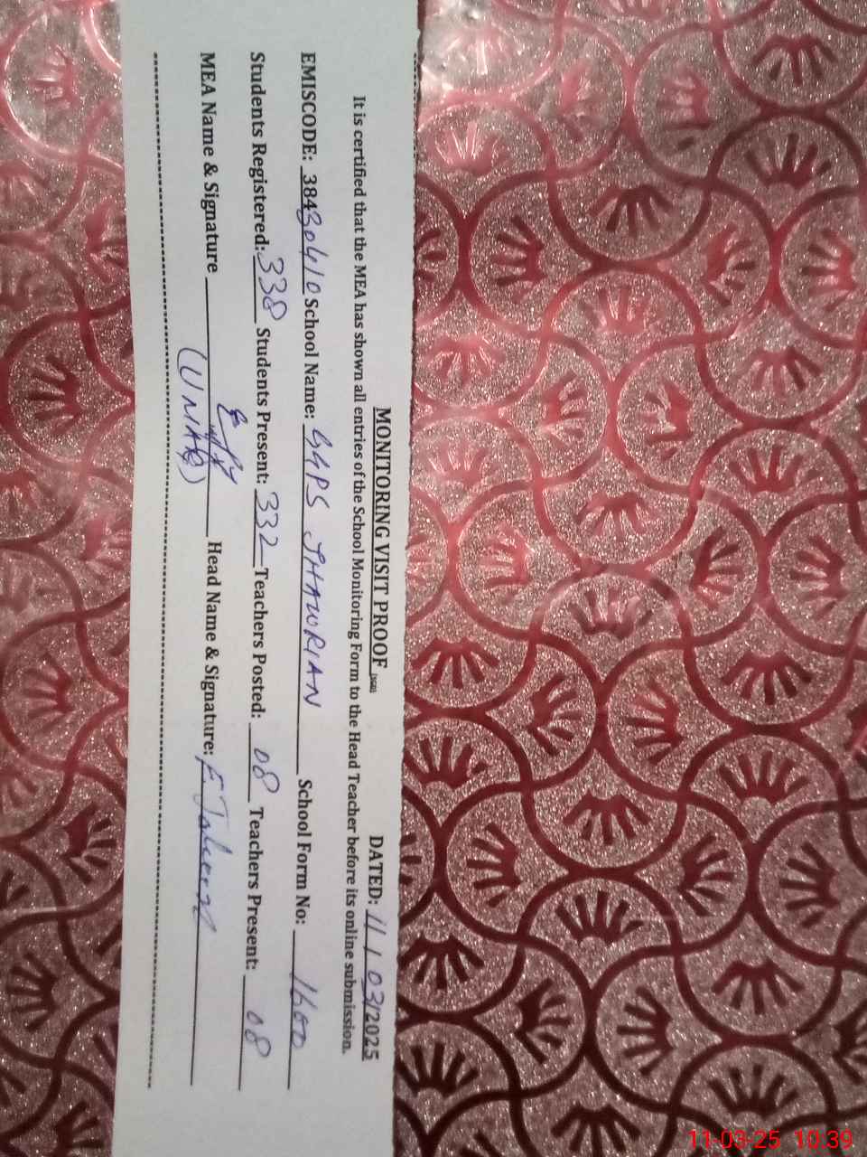 | Certified that this School was Inspected by the Undersigned MEA/DMO Today and the Information Stated Above is as Per Record. | |||||