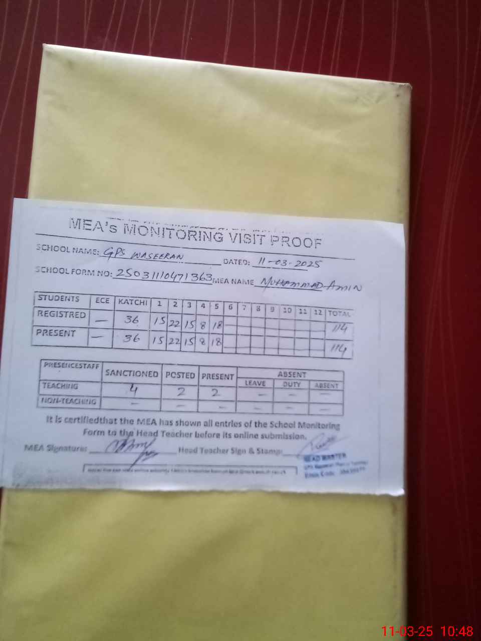 | Attendance Register | Head Teacher | MEA with School | Visit Proof |