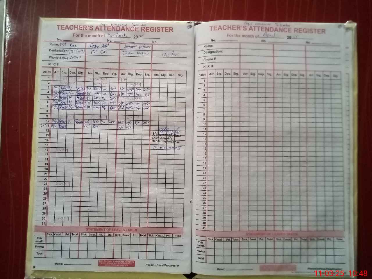 | Name: MU**** RI**** Designation: (School Headmaster's/Headmistress's) PST Phone/Cell Number: 03**** |