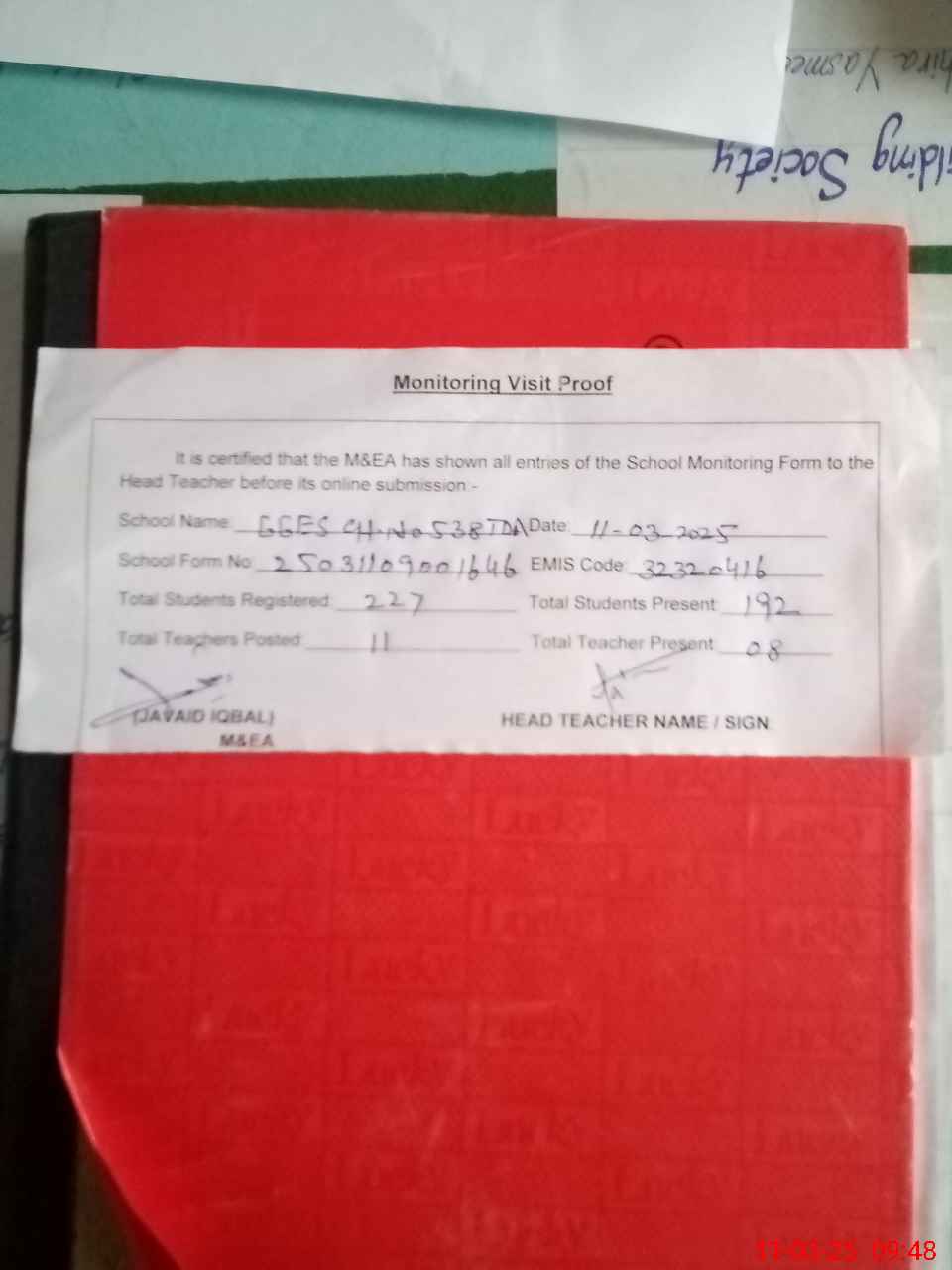 | Attendance Register | Head Teacher | MEA with School | Visit Proof |