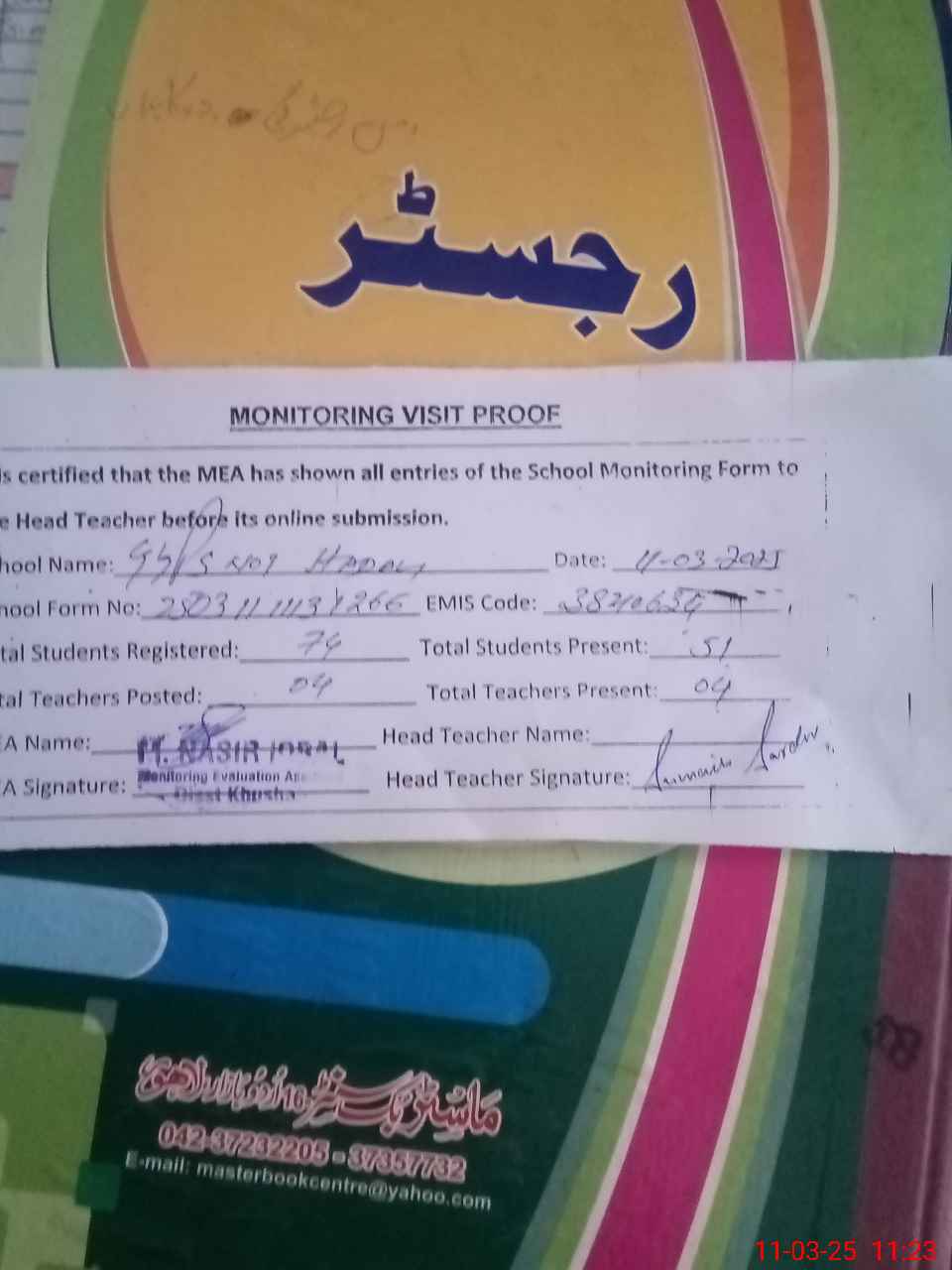 | Attendance Register | Head Teacher | MEA with School | Visit Proof |