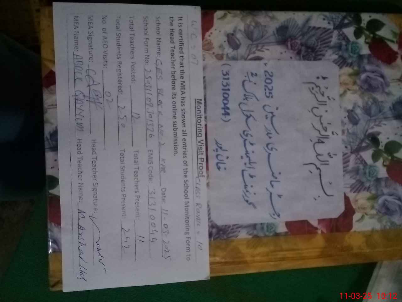 | Attendance Register | Head Teacher | MEA with School | Visit Proof |