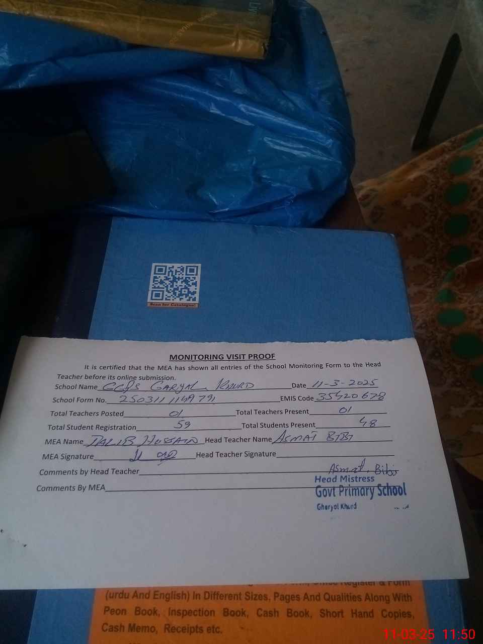 | Attendance Register | Head Teacher | MEA with School | Visit Proof |