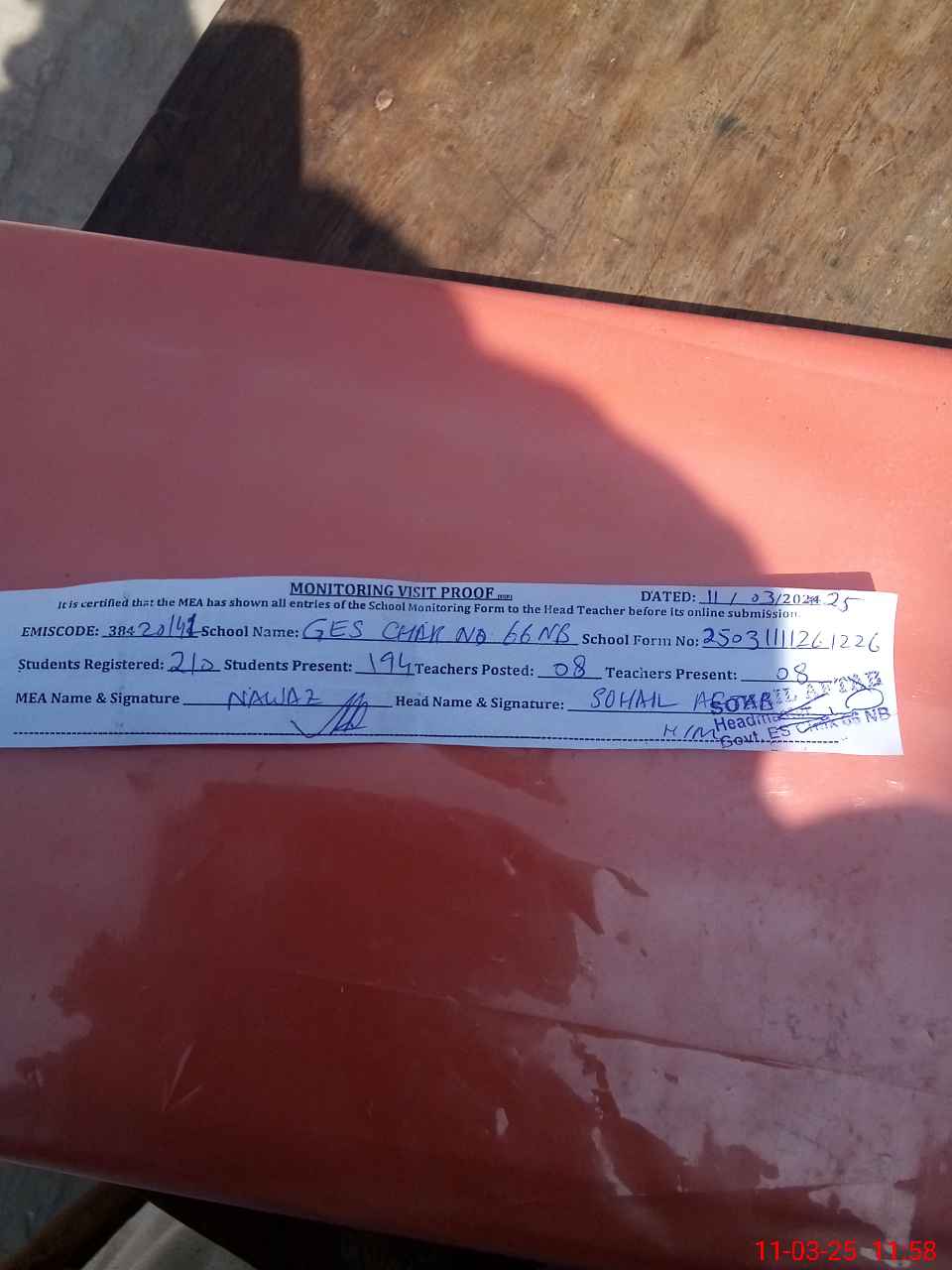 | Attendance Register | Head Teacher | MEA with School | Visit Proof |