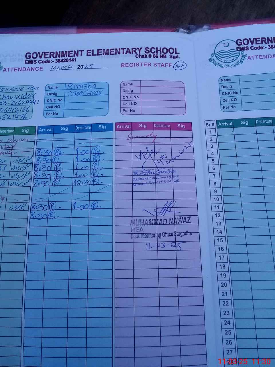 | Name: SO**** AF**** Designation: (School Headmaster's/Headmistress's) SST (SCIENCE) Phone/Cell Number: 03**** |