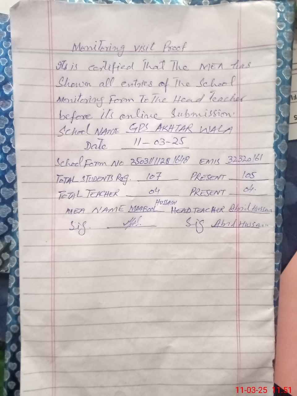 | Attendance Register | Head Teacher | MEA with School | Visit Proof |