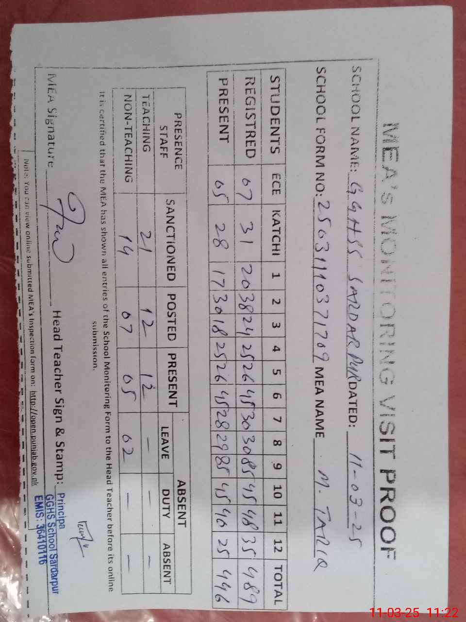 | EMIS Code: 36410116 | Name of School: GGHSS SARDAR PUR, SARAI SIDHU | |||