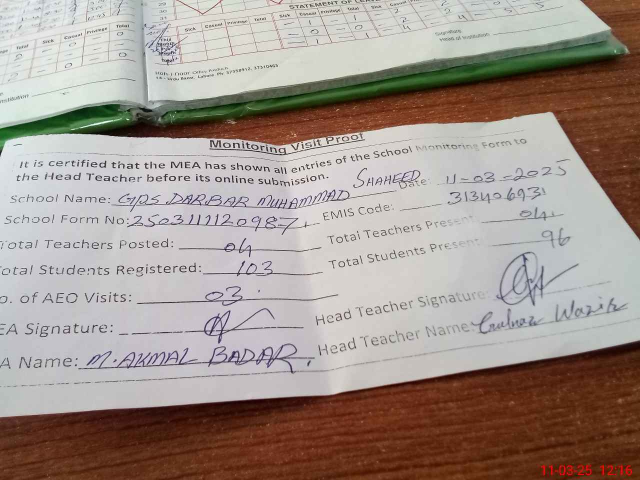 | Attendance Register | Head Teacher | MEA with School | Visit Proof |