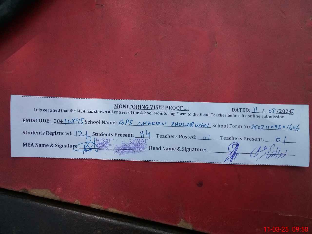 | Attendance Register | Head Teacher | MEA with School | Visit Proof |