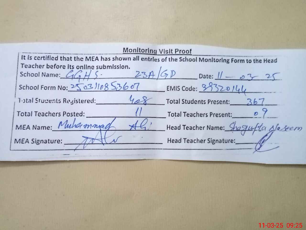 | Attendance Register | Head Teacher | MEA with School | Visit Proof |