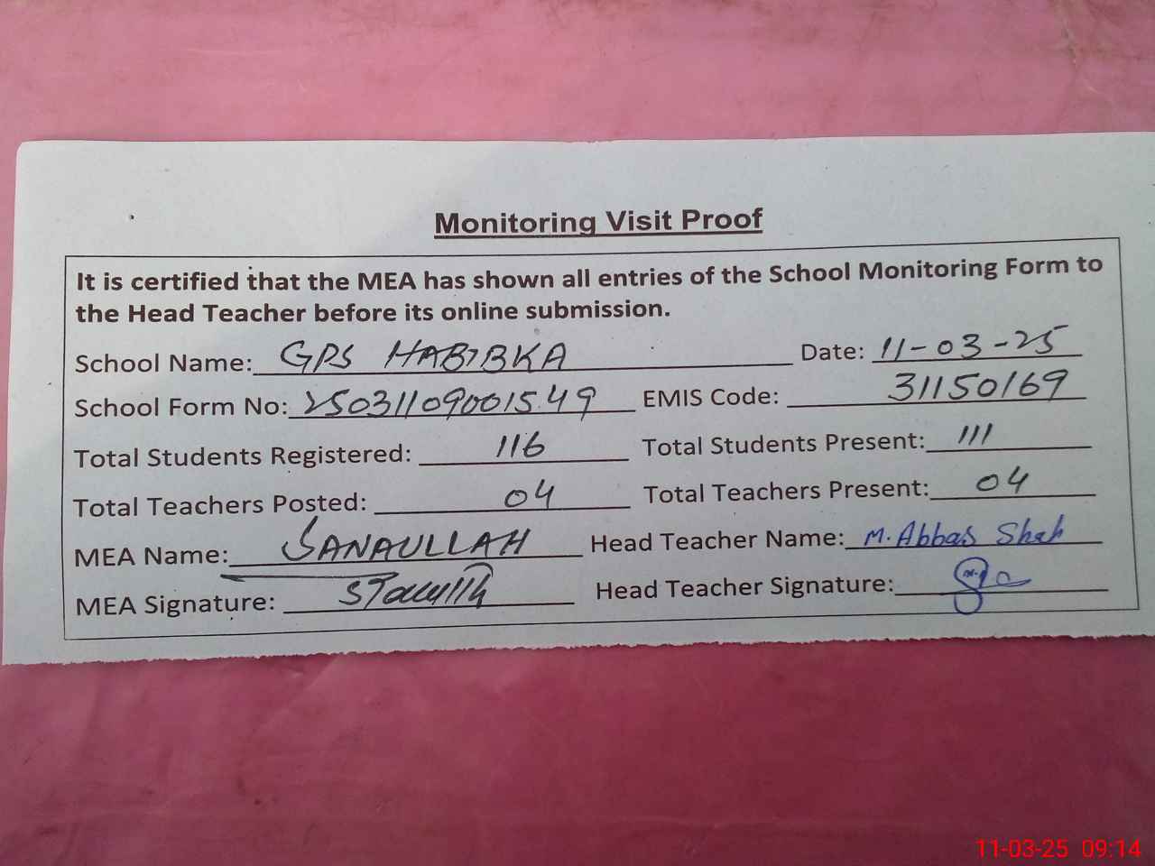 | Attendance Register | Head Teacher | MEA with School | Visit Proof |