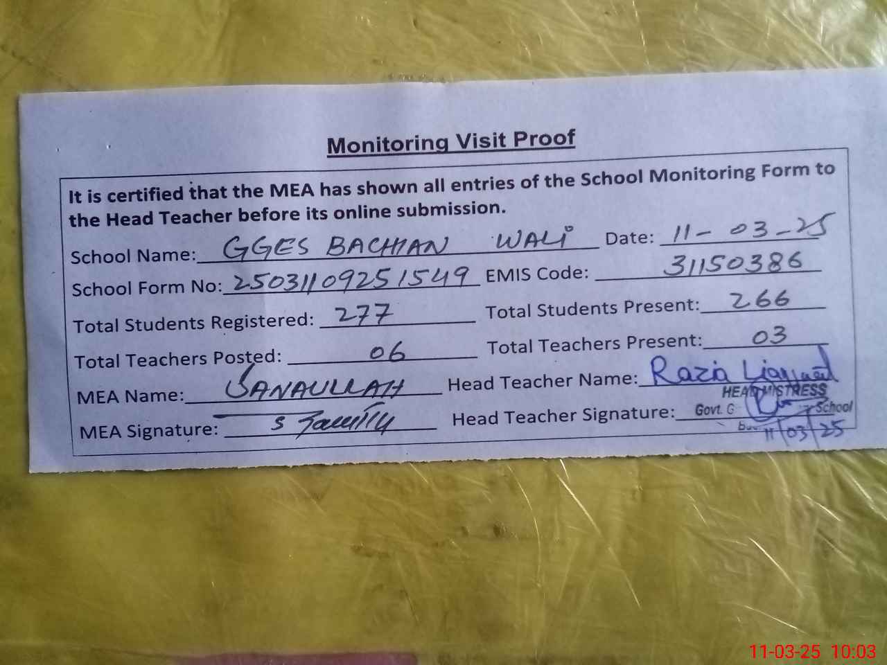 | Attendance Register | Head Teacher | MEA with School | Visit Proof |