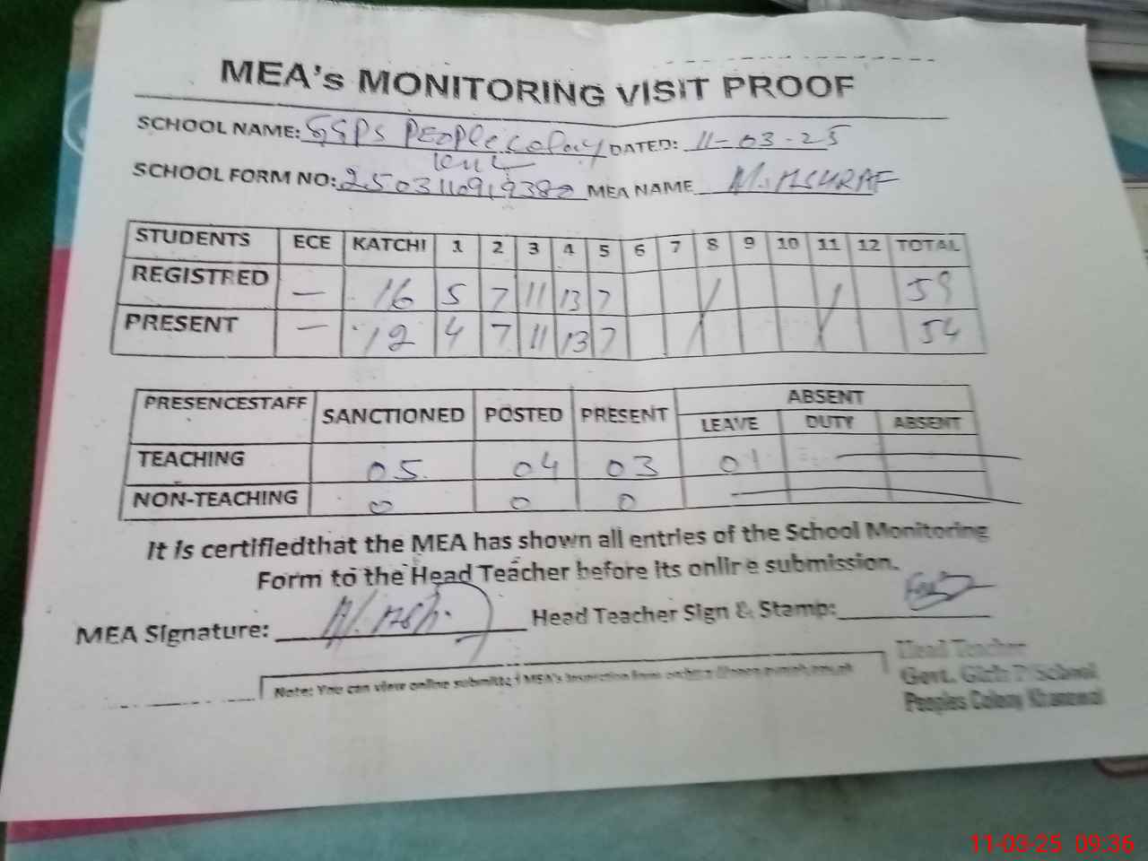| Attendance Register | Head Teacher | MEA with School | Visit Proof |