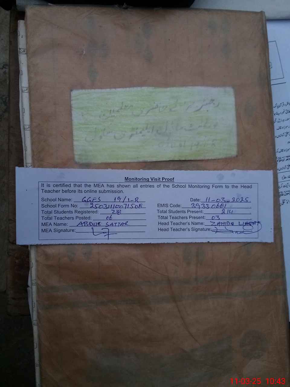 | EMIS Code: 39330681 | Name of School: GGES CHAK NO. 19/1-R | |||
