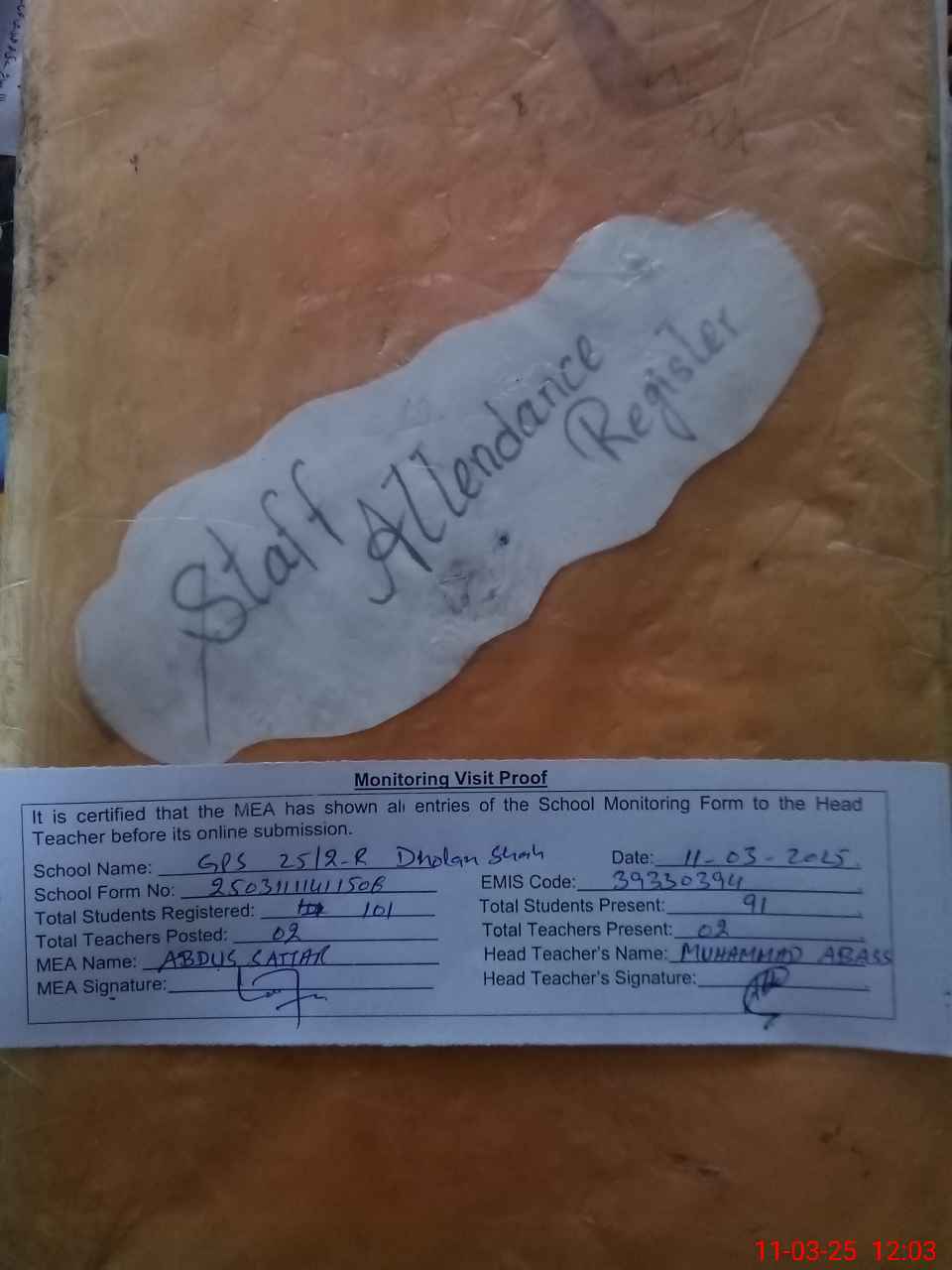 | Attendance Register | Head Teacher | MEA with School | Visit Proof |