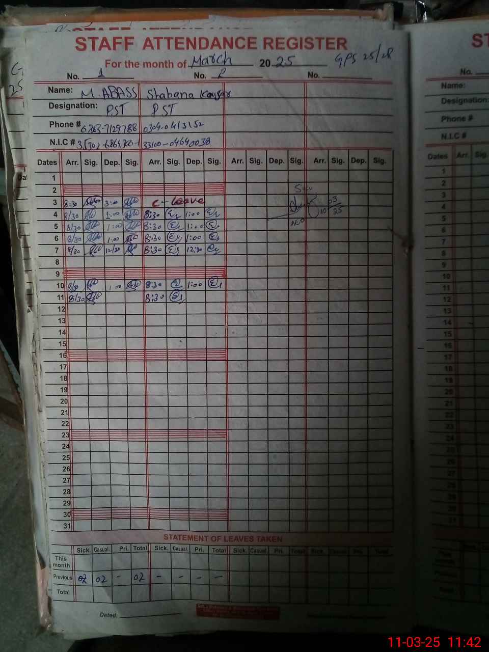 | CNIC | Full Name | Designation | R/C | Absence During Last Calender Month |