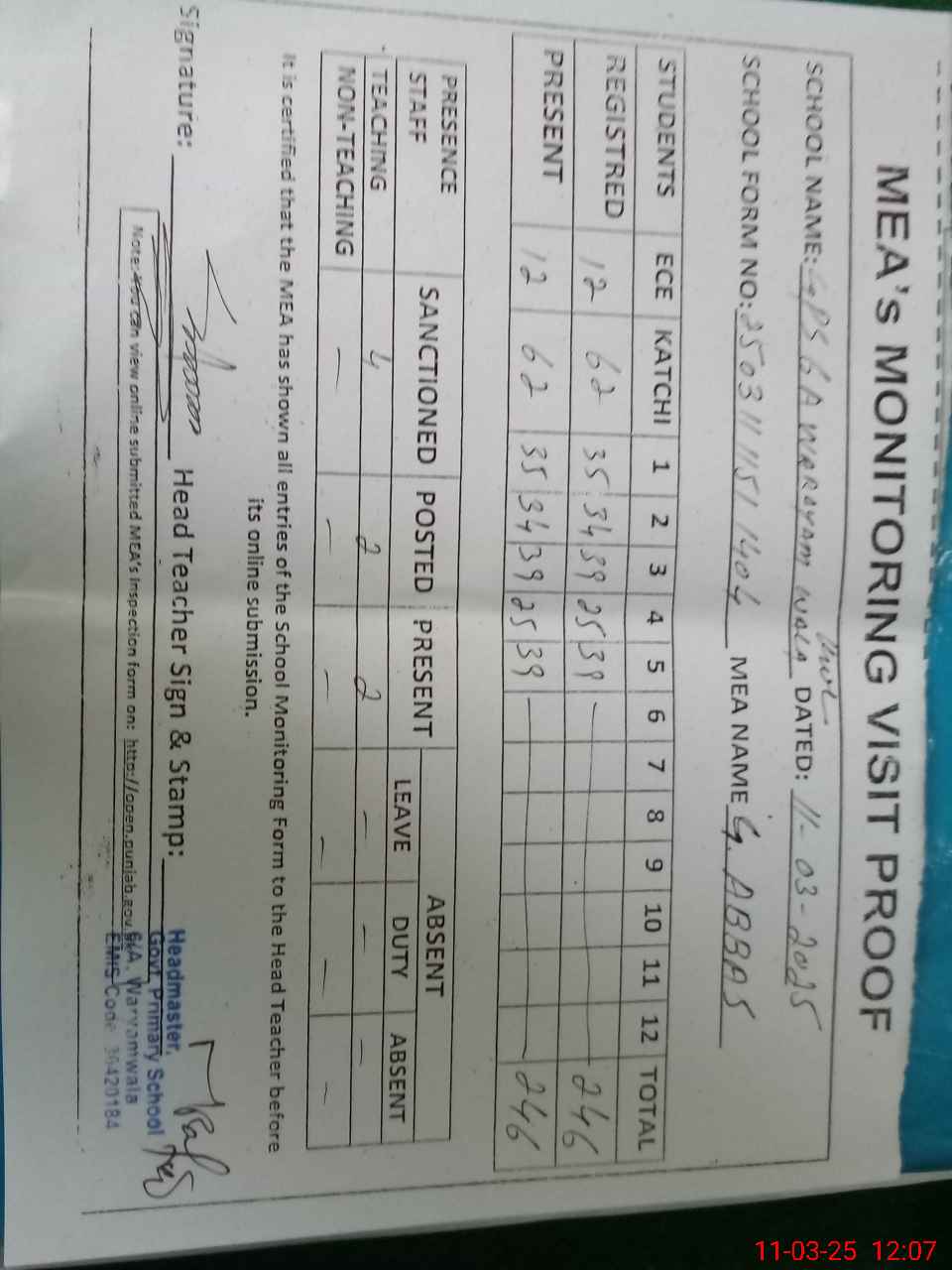 | EMIS Code: 36420184 | Name of School: GPS 6/A WARAYAM WALA, P/O 5/AH, KHANEWAL | |||