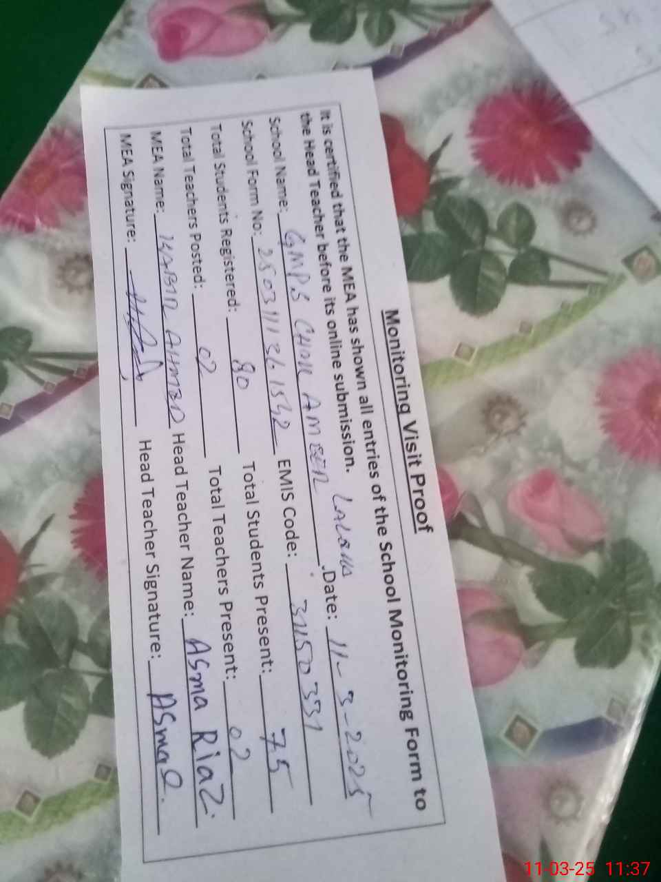 | Attendance Register | Head Teacher | MEA with School | Visit Proof |