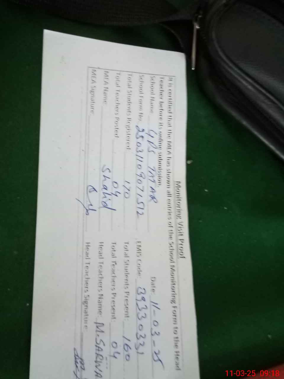 | Name: Mu**** Sa**** Designation: (School Headmaster's/Headmistress's) PTC/JV Phone/Cell Number: 03**** |