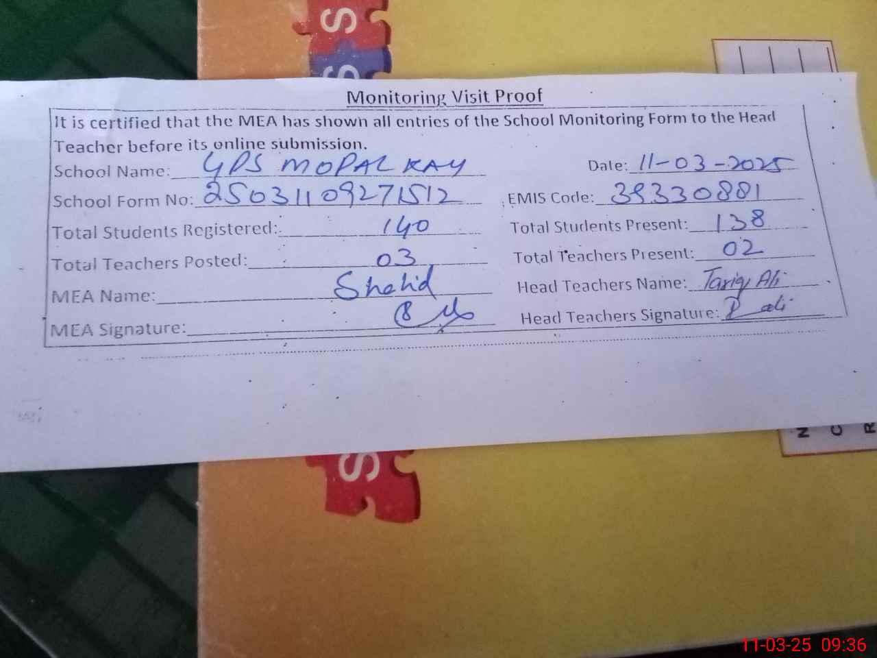 | Attendance Register | Head Teacher | MEA with School | Visit Proof |