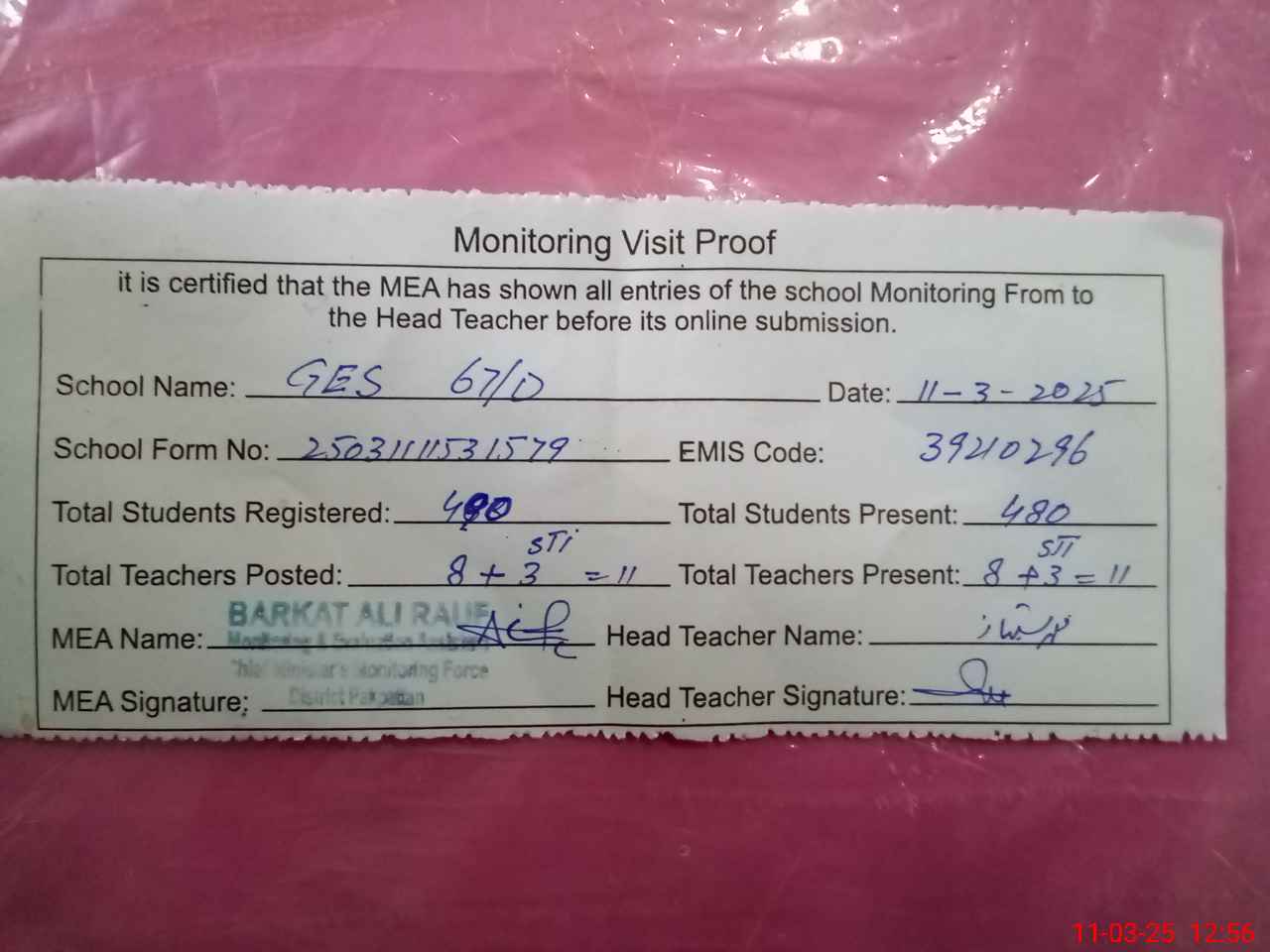 | EMIS Code: 39210296 | Name of School: GHS 67 D | |||
