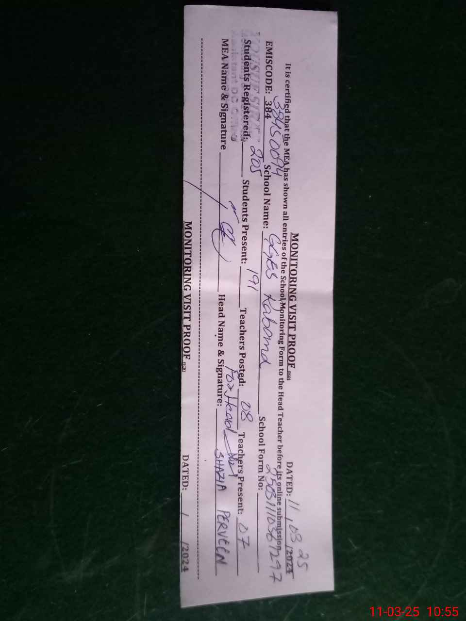 | Certified that this School was Inspected by the Undersigned MEA/DMO Today and the Information Stated Above is as Per Record. | |||||