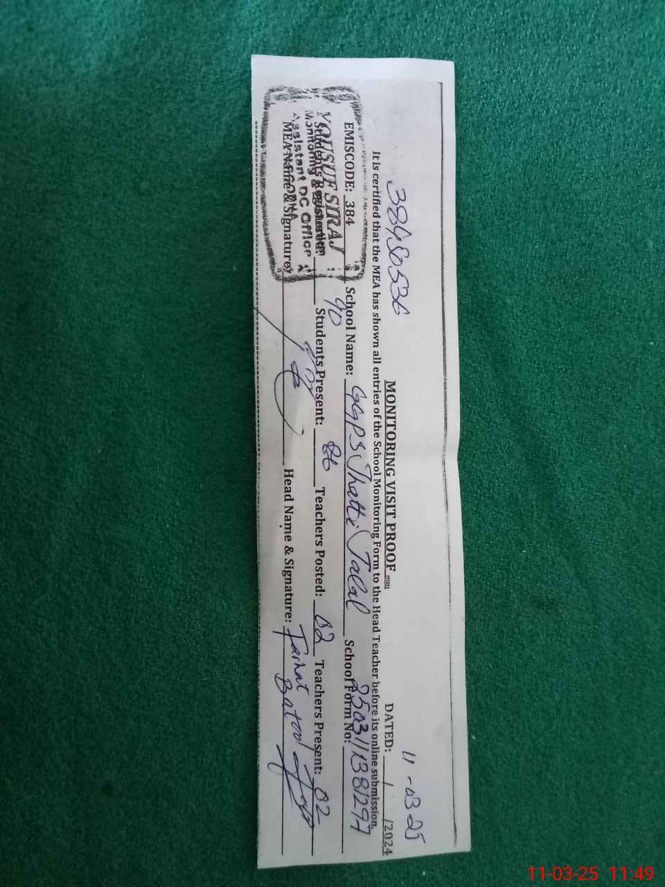 | Certified that this School was Inspected by the Undersigned MEA/DMO Today and the Information Stated Above is as Per Record. | |||||