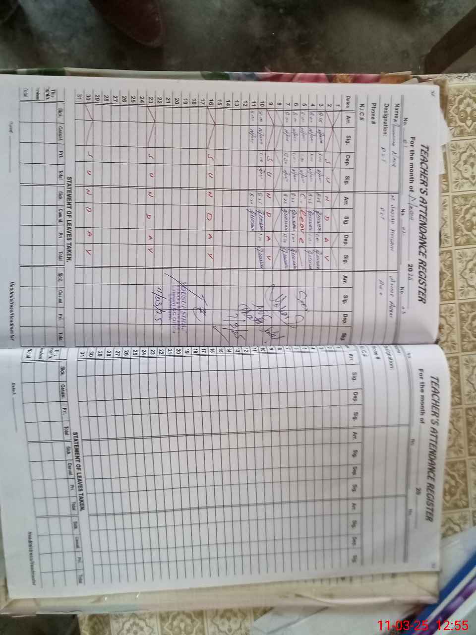 | CNIC | Full Name | Designation | R/C | Absence During Last Calender Month |