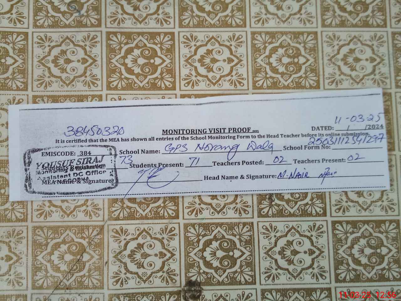 | Attendance Register | Head Teacher | MEA with School | Visit Proof |