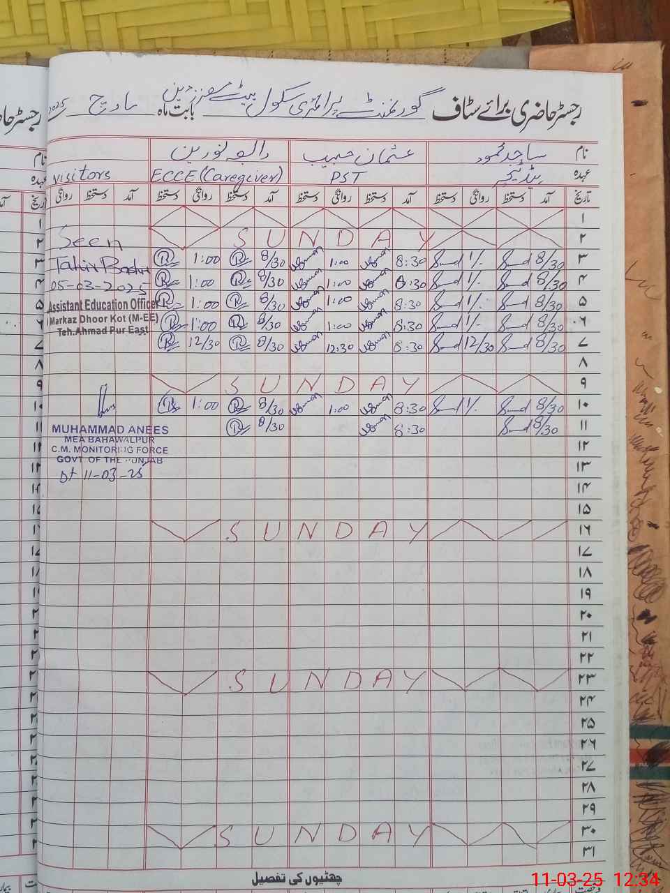 | CNIC | Full Name | Designation | R/C | Absence During Last Calender Month |