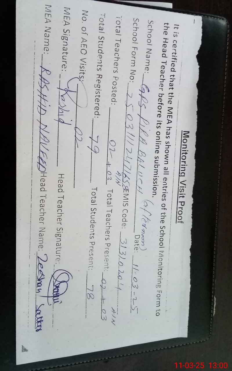 | EMIS Code: 31310204 | Name of School: GPS PIRA BALUCH (After Noon) | |||