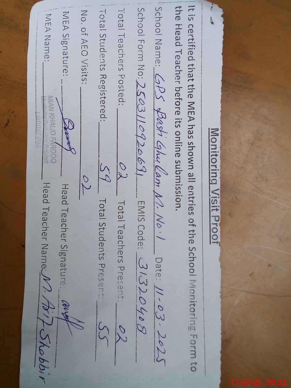 | EMIS Code: 31320408 | Name of School: GPS BASTI GHULAM MUHAMMAD NO.1 | |||