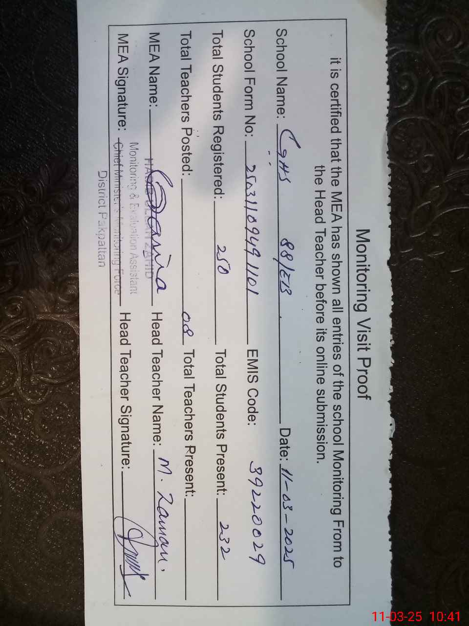 | Certified that this School was Inspected by the Undersigned MEA/DMO Today and the Information Stated Above is as Per Record. | |||||