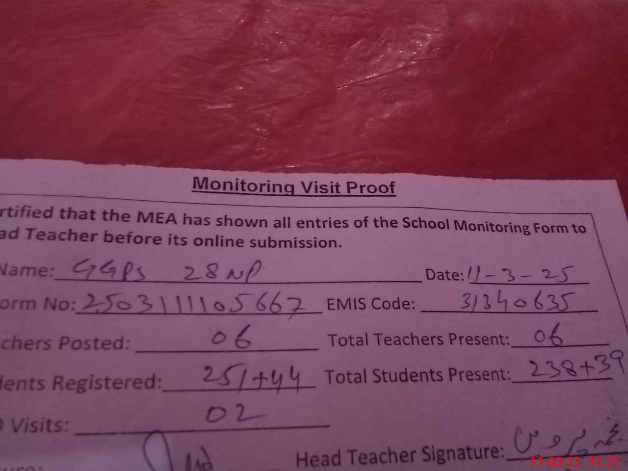 | Attendance Register | Head Teacher | MEA with School | Visit Proof |