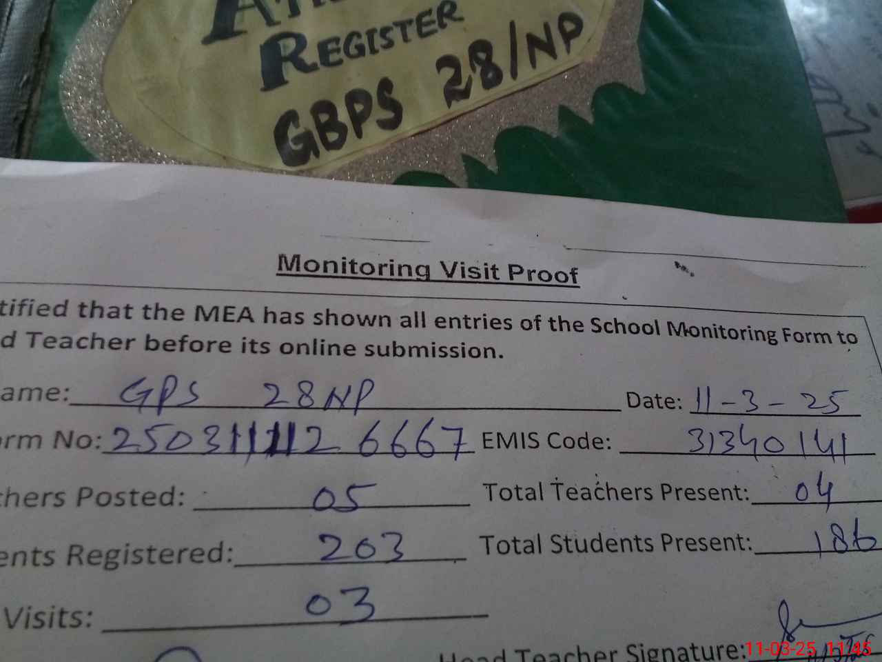 | Attendance Register | Head Teacher | MEA with School | Visit Proof |