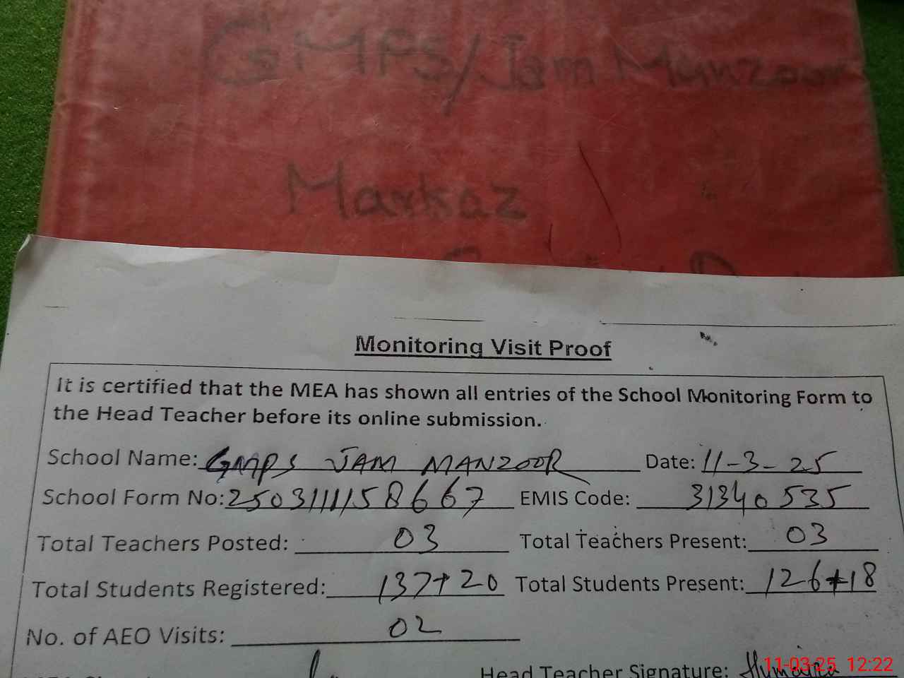 | Attendance Register | Head Teacher | MEA with School | Visit Proof |