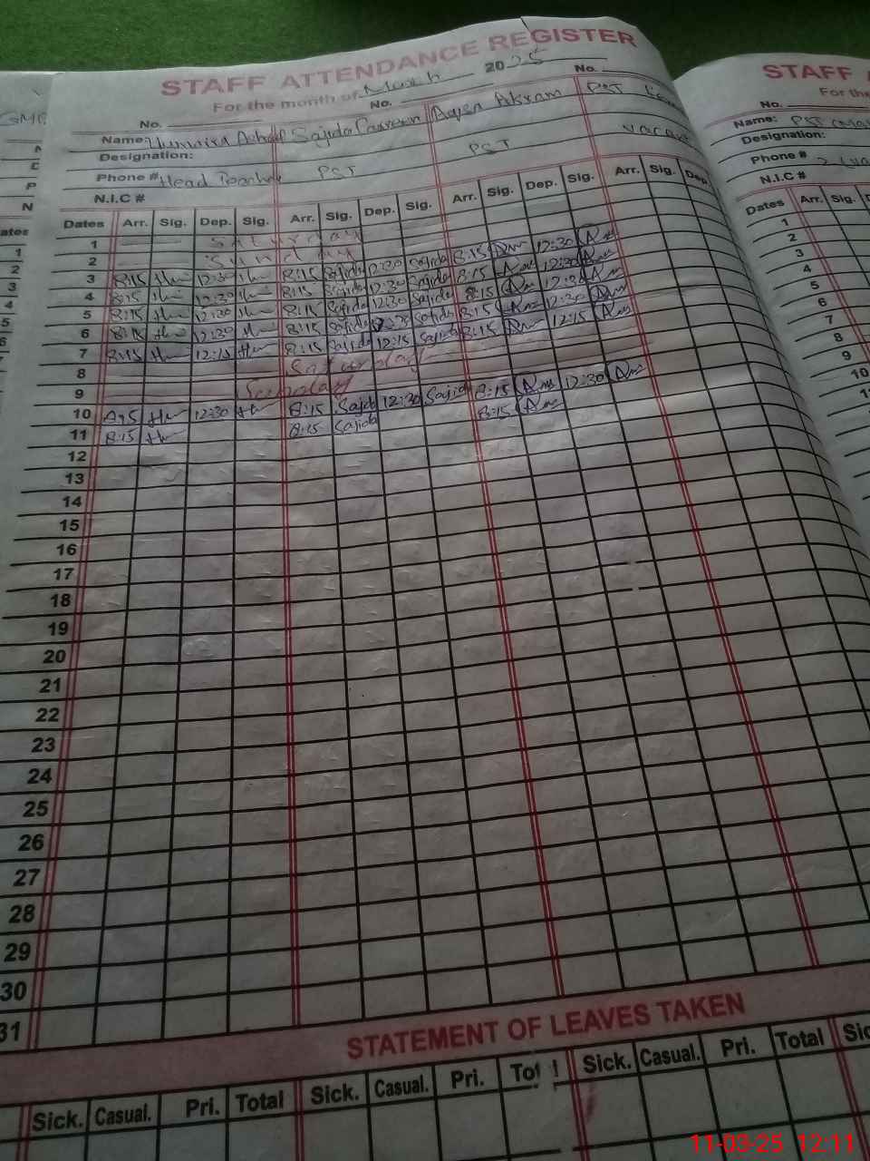| CNIC | Full Name | Designation | R/C | Absence During Last Calender Month |