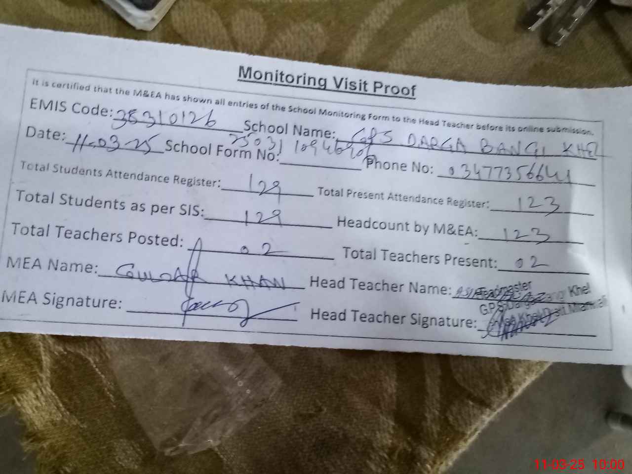 | EMIS Code: 38310126 | Name of School: GPS DARGA BANGI KHEL | |||