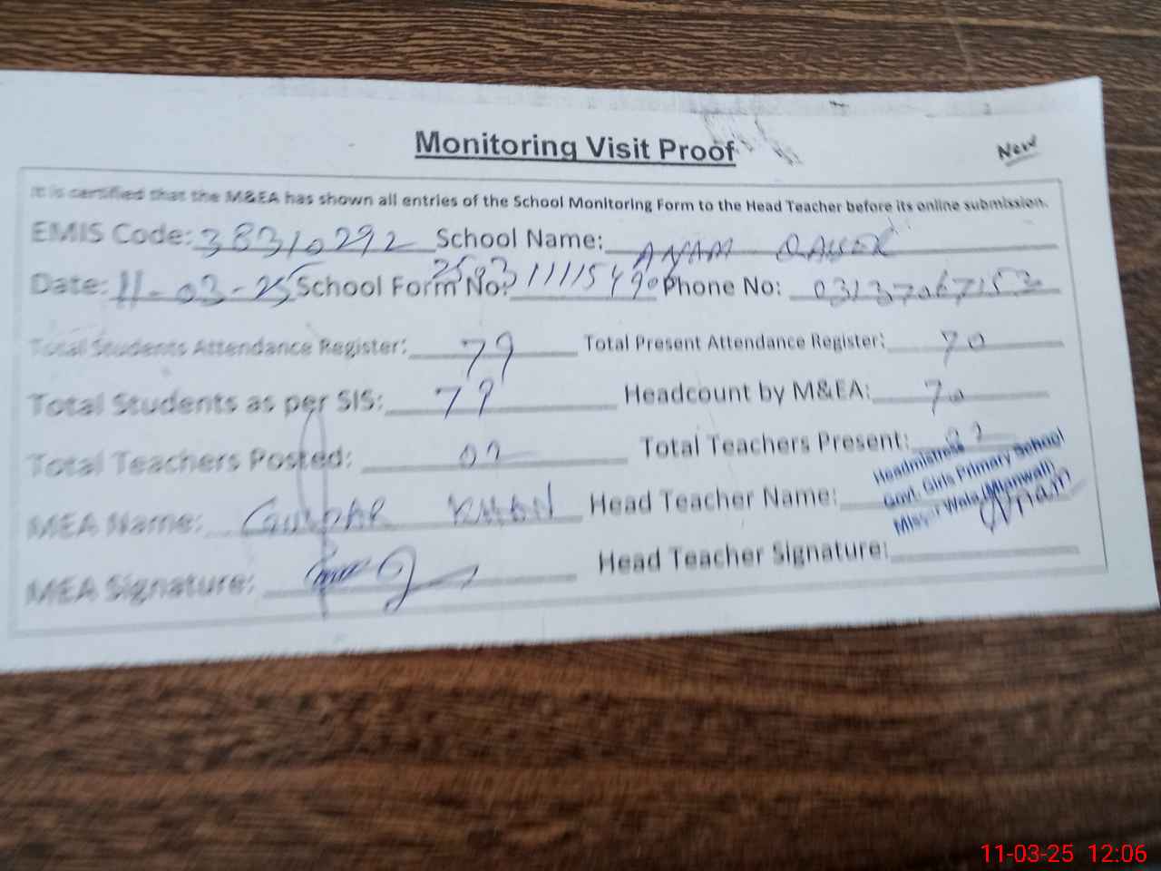 | Attendance Register | Head Teacher | MEA with School | Visit Proof |