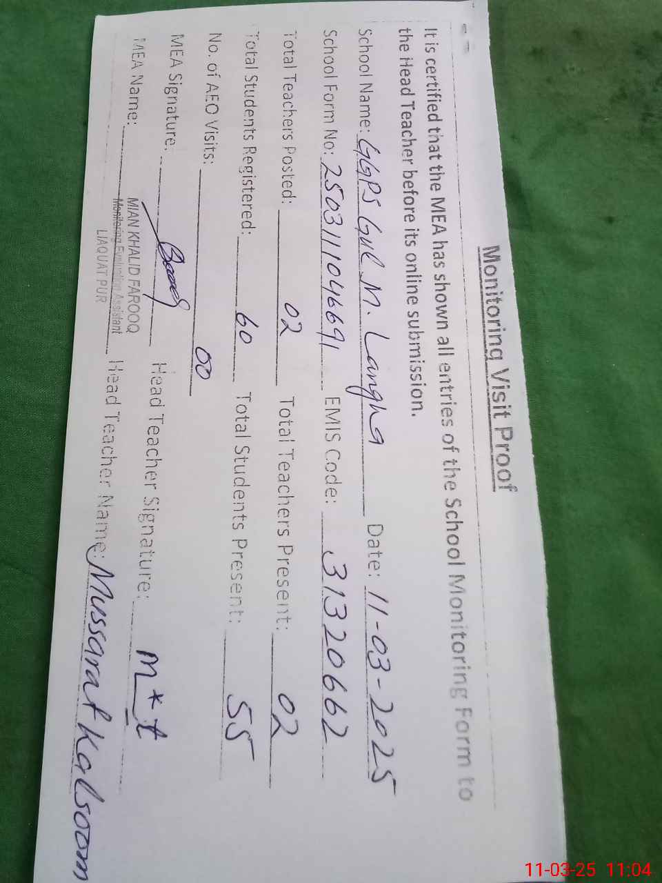 | Attendance Register | Head Teacher | MEA with School | Visit Proof |