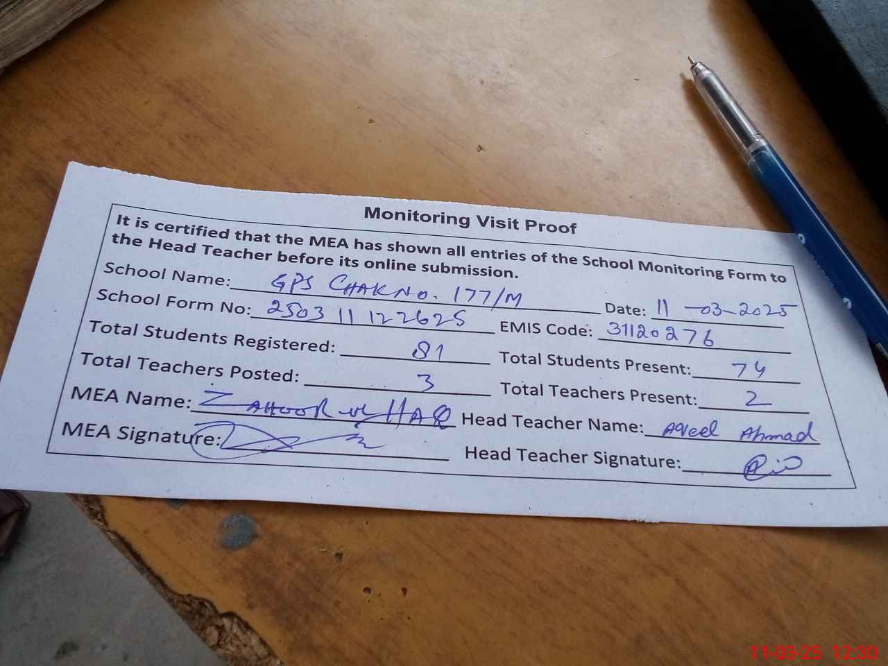 | EMIS Code: 31120276 | Name of School: GPS CHAK NO 177/M | |||