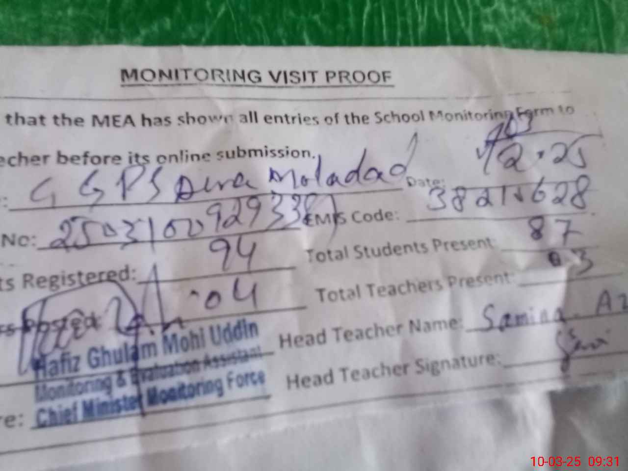 | EMIS Code: 38210628 | Name of School: GGPS DERA MOLADAD | |||